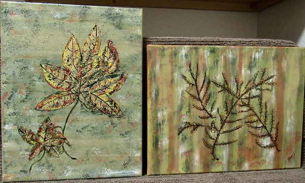 Pair of Acrylic on Canvas. Deco leaf motif. Signed